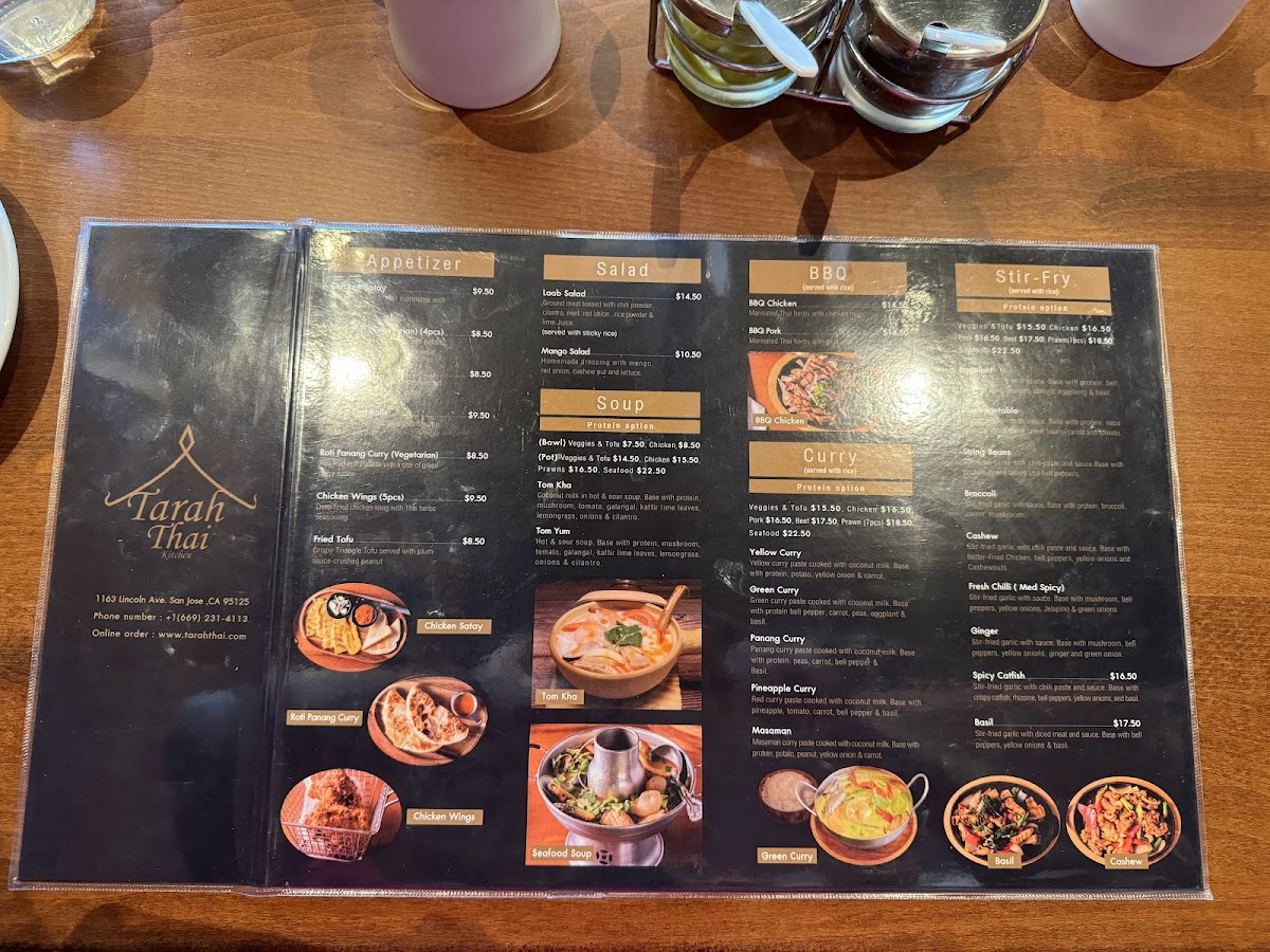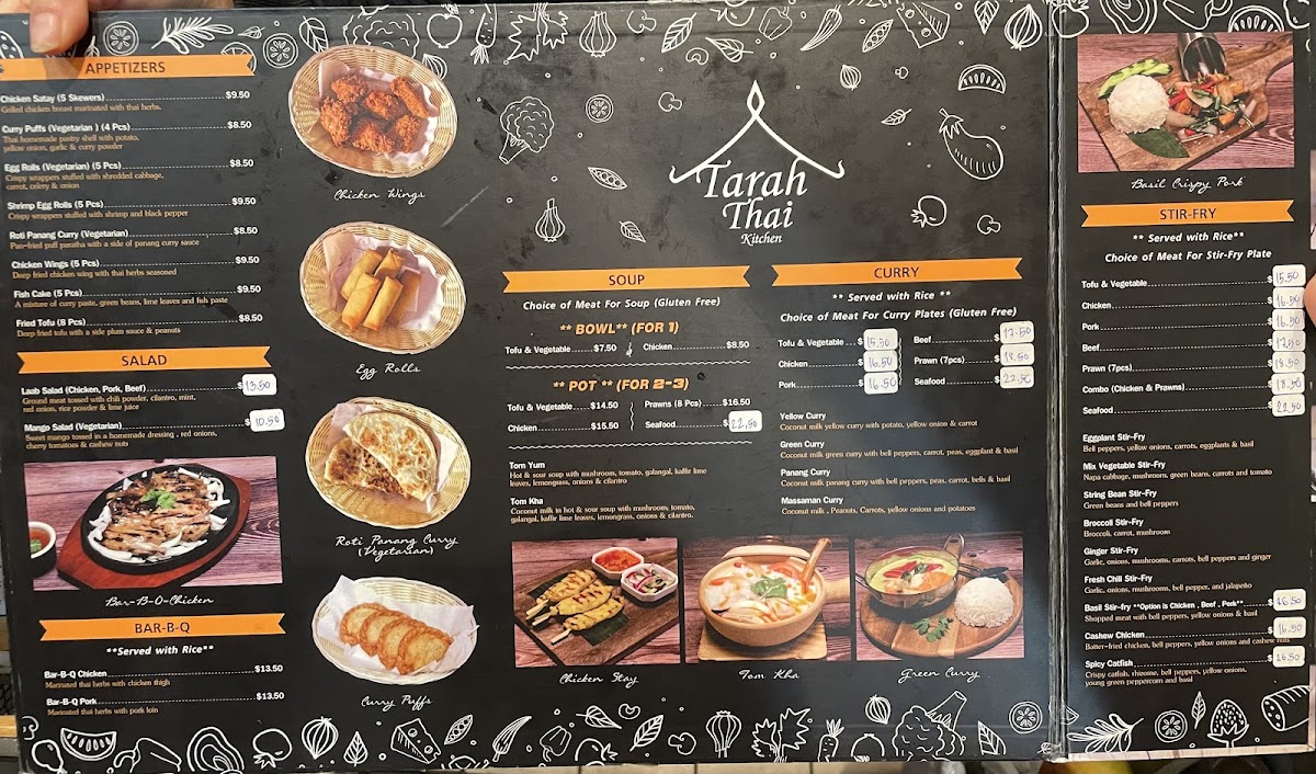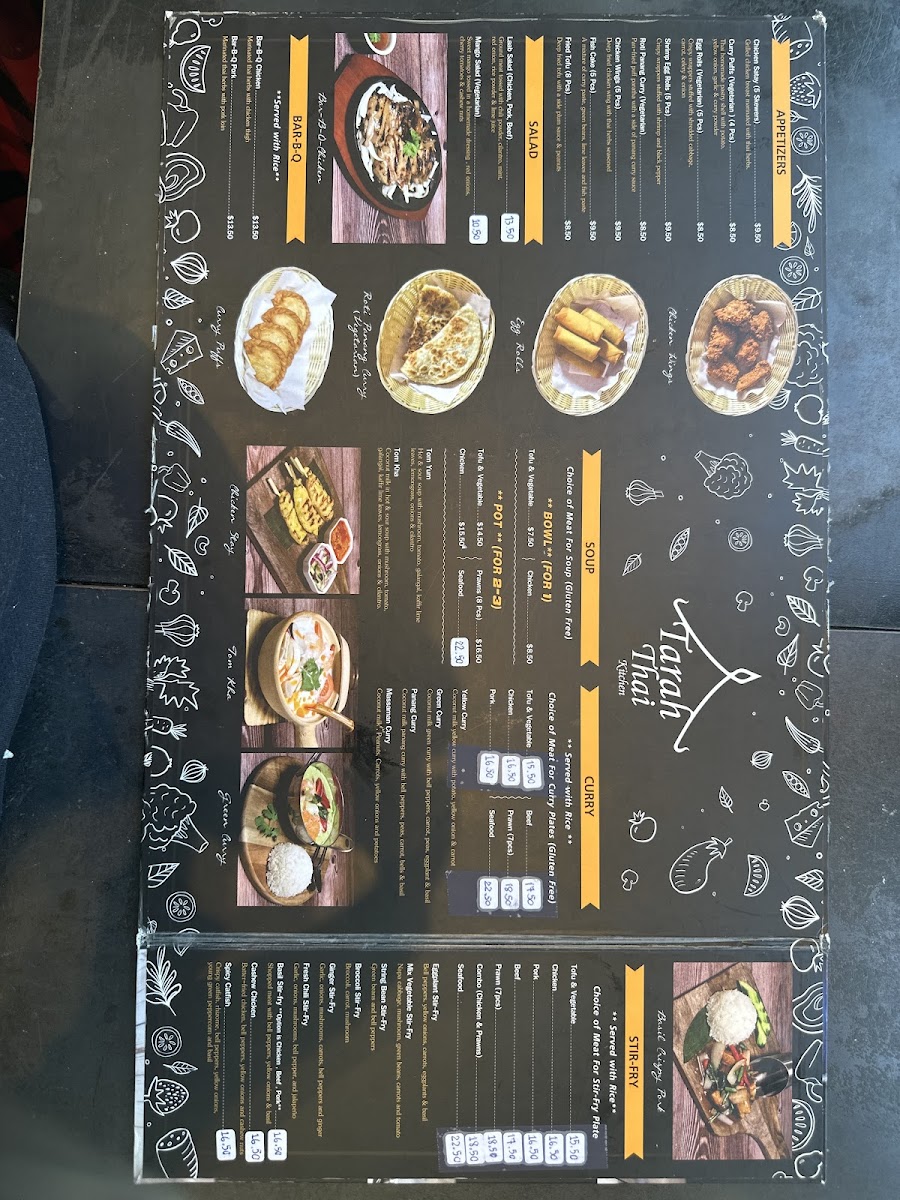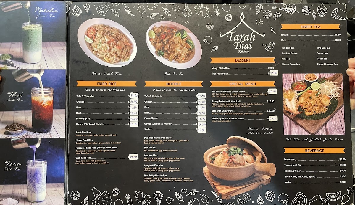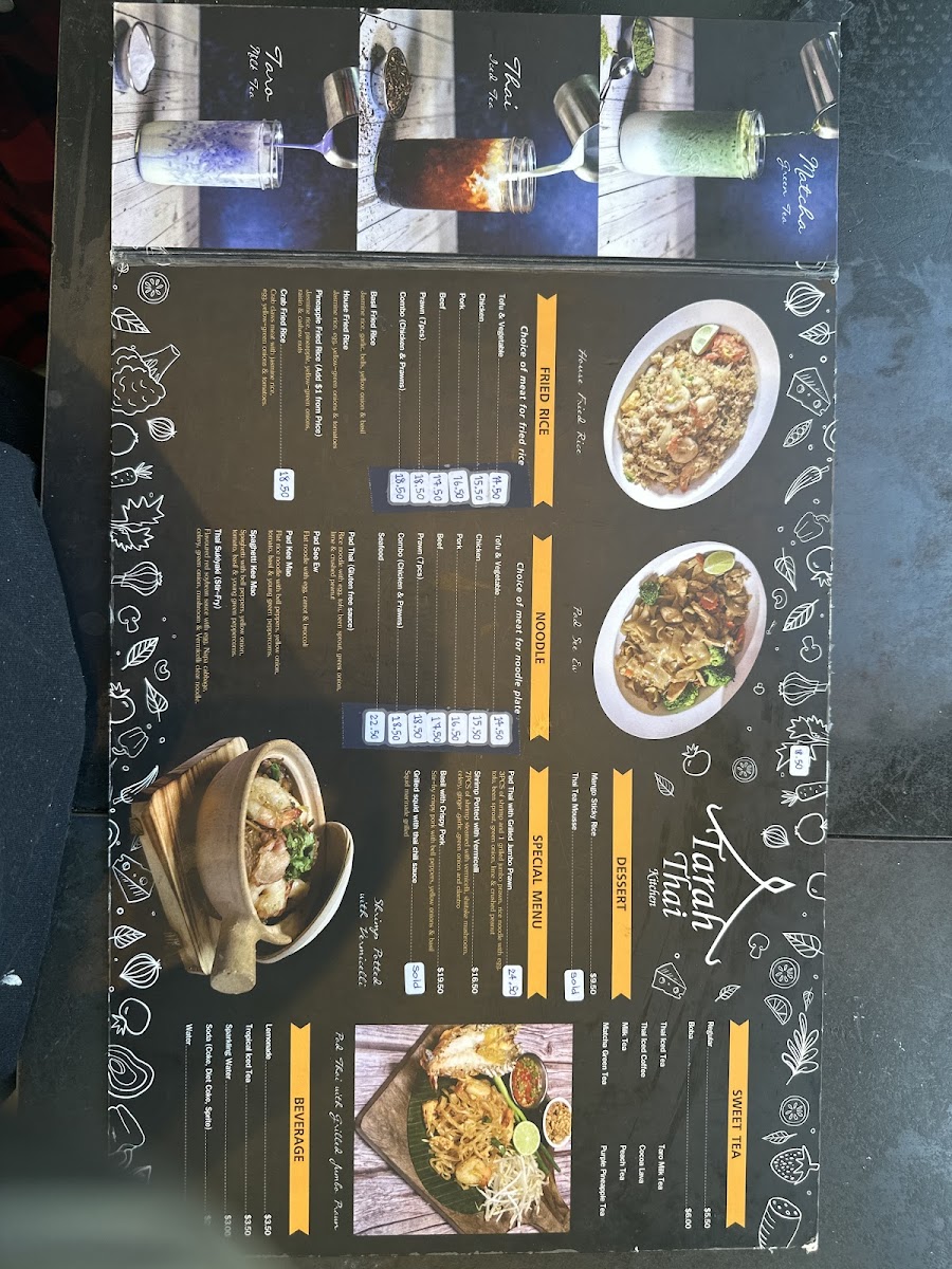 From a reviewer’s perspective, the menu at Tarah Thai Kitchen offers a wide and satisfying selection, featuring flavorful barbecue options like BBQ Chicken, BBQ Pork, and BBQ Pork Jowl, along with creative wings such as Wings Basil, Wings Zaap, and Wings Tomyum. The appetizer selection includes favorites like Fried Tofu, Shrimp Egg Rolls, Roti Panang Curry, and Chicken Satay (5 SKEW), while soups such as Tom Yum (Pot), Tom Kha (Bowl), and Light Soup (Pot Size) provide comforting starters. The curry section is especially appealing with dishes like Massaman Curry, Panang Curry, Green Curry, Yellow Curry, and Duck Curry, and the noodle offerings like Pad Thai, Pad See Ew, Pad Kee Mao, and Thai Sukiyaki are classic Thai staples done well. House specialties such as Khao Soi Chicken, Kaprao Beef Spicy, Basil Crispy Pork, and Duck Fried Rice stand out as must-try items, while fried rice options like Pineapple Fried Rice, Basil Fried Rice, and Crab Fried Rice add variety. To finish, desserts like Thai Coconut Ice Cream and drinks such as Thai Iced Coffee, Hot Tea, and Coconut Juice round out the experience, making the menu diverse, flavorful, and well worth exploring.