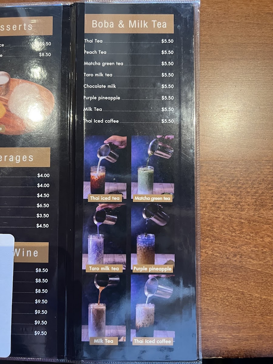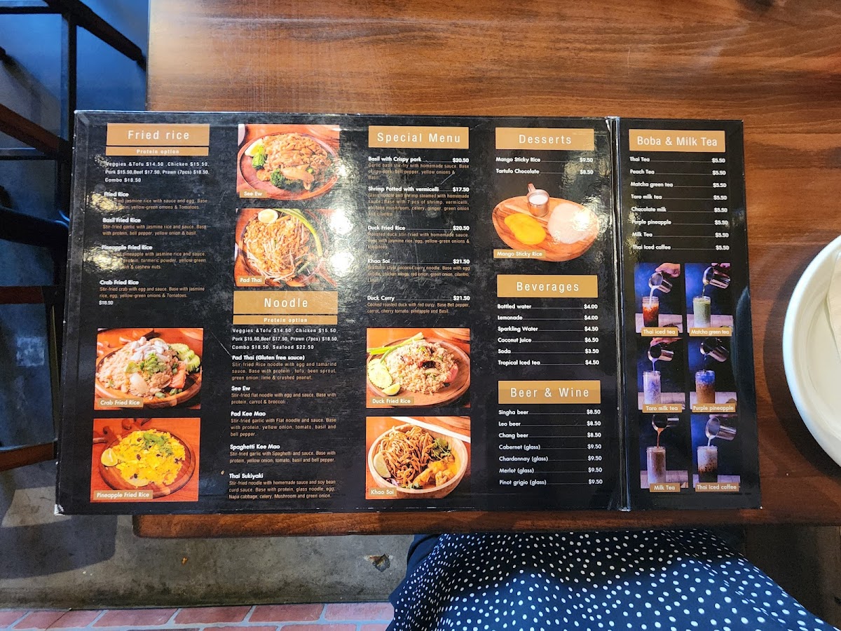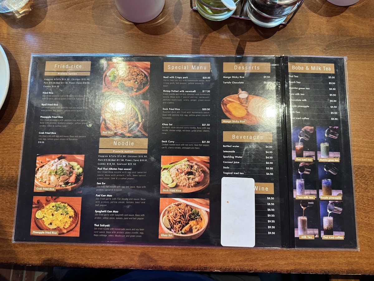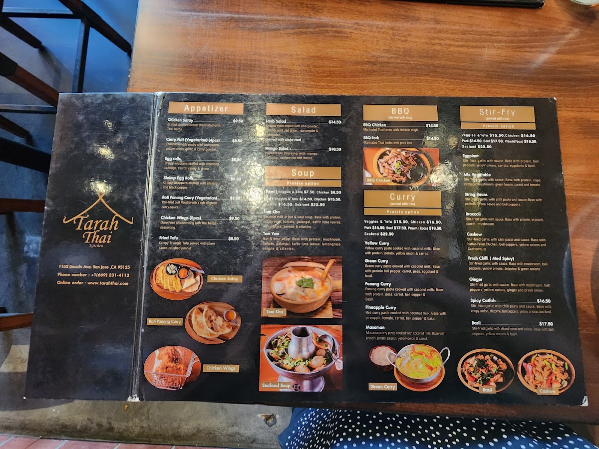 From a reviewer’s perspective, the menu at Tarah Thai Kitchen offers a wide and satisfying selection, featuring flavorful barbecue options like BBQ Chicken, BBQ Pork, and BBQ Pork Jowl, along with creative wings such as Wings Basil, Wings Zaap, and Wings Tomyum. The appetizer selection includes favorites like Fried Tofu, Shrimp Egg Rolls, Roti Panang Curry, and Chicken Satay (5 SKEW), while soups such as Tom Yum (Pot), Tom Kha (Bowl), and Light Soup (Pot Size) provide comforting starters. The curry section is especially appealing with dishes like Massaman Curry, Panang Curry, Green Curry, Yellow Curry, and Duck Curry, and the noodle offerings like Pad Thai, Pad See Ew, Pad Kee Mao, and Thai Sukiyaki are classic Thai staples done well. House specialties such as Khao Soi Chicken, Kaprao Beef Spicy, Basil Crispy Pork, and Duck Fried Rice stand out as must-try items, while fried rice options like Pineapple Fried Rice, Basil Fried Rice, and Crab Fried Rice add variety. To finish, desserts like Thai Coconut Ice Cream and drinks such as Thai Iced Coffee, Hot Tea, and Coconut Juice round out the experience, making the menu diverse, flavorful, and well worth exploring.